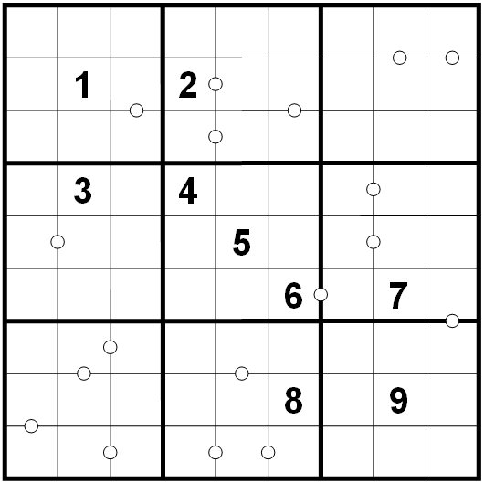 Place the digits 1 to 9 in every row, column and in each 3x3-box each once. If there is a little dot between two cells, then the difference of these two digits should be 1. All dots are given.
