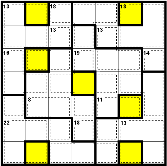 Platziere die Ziffern von 1 bis 7 in jeder Zeile, jeder Spalte, den fett umrandeten Gebieten und die gelbe Zellen. Die kleinen Zahlen geben die Summe der Ziffern in den markierten Gebieten an. Innerhalb dieser Gebiete dürfen sich Ziffern nicht wiederholen.