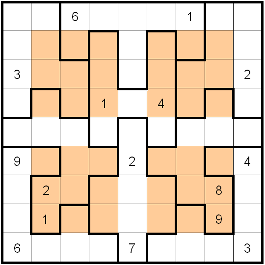 Place the digits from 1 tot 9 in every row, column, every boldly outlined irregular area and the four coloured 3x3-blocks.