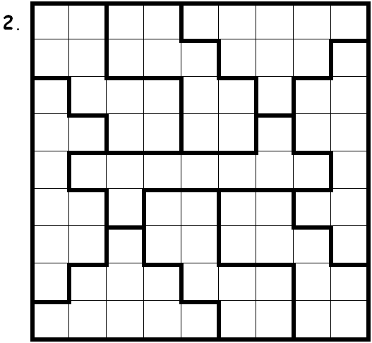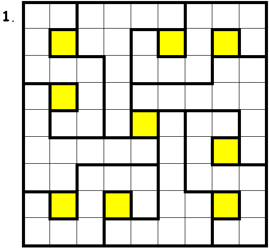 Place the digits from 1 to 9 in both empty grids (1 and 2) in every row, column, boldly outlined irregular area (and in the yellow cells).