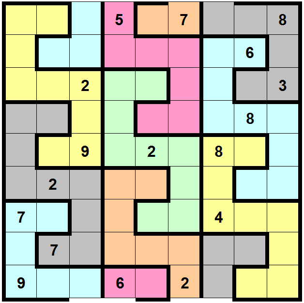 Place the digits from 1 tot 9 in every row, column and every boldly outlined, coloured irregular area. Some of the coloured areas wrap around the grid from top to bottom.
