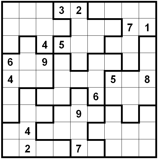 Place the digits from 1 tot 9 in every row, column and every boldly outlined irregular area.