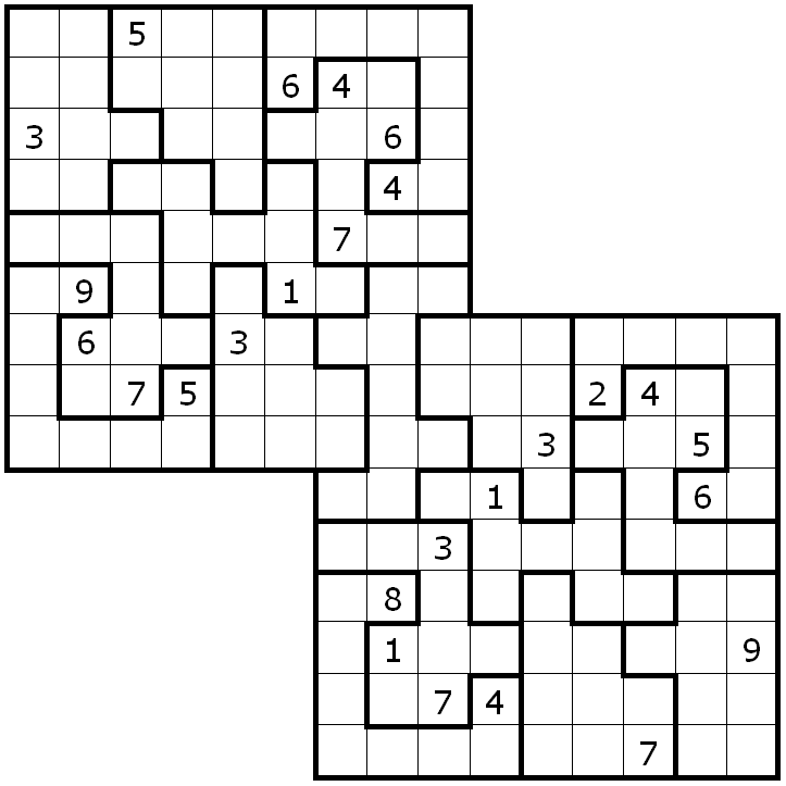 Here are two chaos sudokus that partly overlap each other. Place the digits from 1 to 9 in every row and column of both grids. For the puzzle as a whole: place the digits from 1 to 9 in every boldly outlined irregular area.