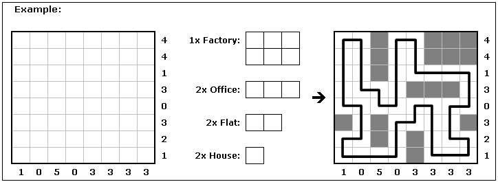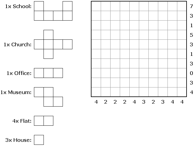 City construction puzzle in the portal. So far, it is the only one. Time to dedicate a full theme-month to this nice puzzle type with another classic puzzle and four variants.
