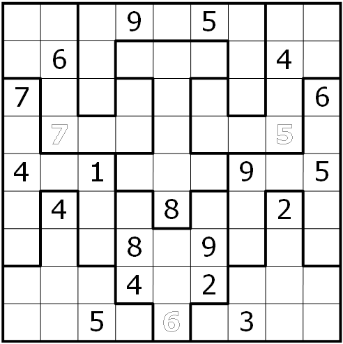 Place the digits from 1 to 9 in every row, column and boldly outlined irregular area.