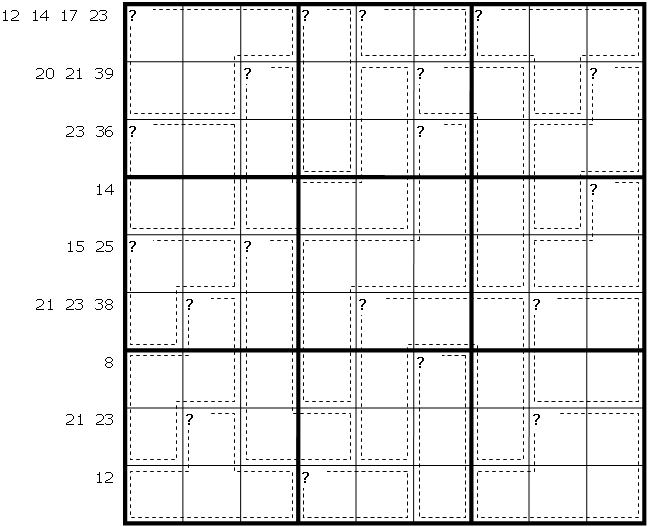 Replace the question marks in each dotted outlined area with a number that is written on the left of the corresponding row. After that, the small numbers in the dotted outlined areas are the sum of the digits in that area. Within a dotted outlined area all digits must be different. Both grids have the same solution.