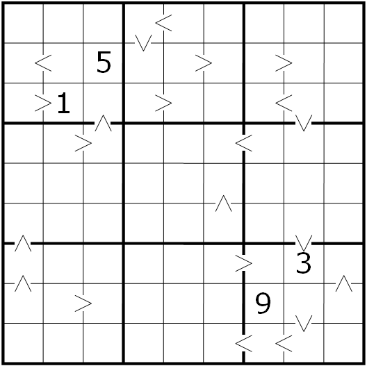 In all cases where the difference between two neighbouring digits is 1, there is a greater or less sign between those digits. Digits must be placed in accordance with the signs.