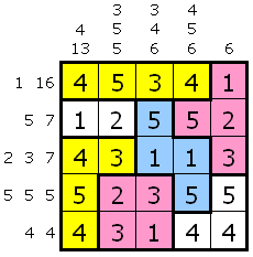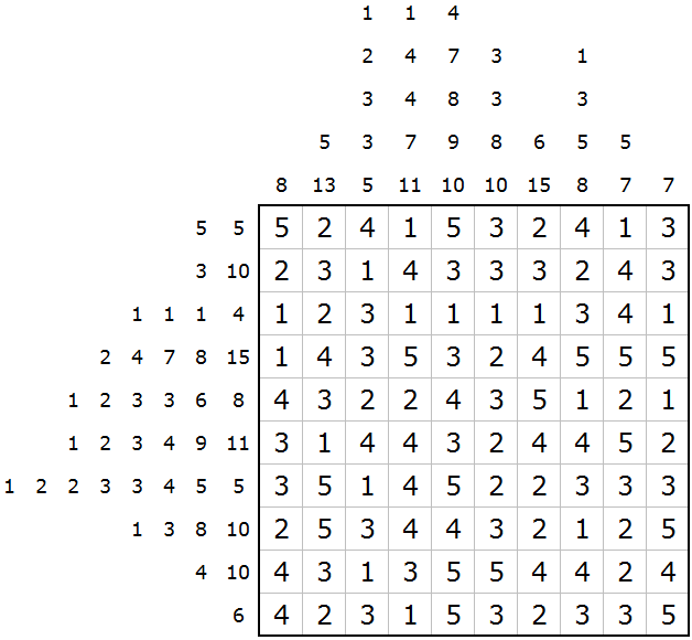 Place all twelve pentominos in the grid. The pentominos may be rotated and/or mirrored. The numbers outside the grid are the sums of the blocks of by pentominos covered cells in the respective row or column. The numbers are sorted in an ascending order.