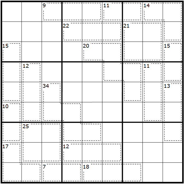 Place the digits from 1 tot 9 in every row, column and 3x3-block. The small numbers in the upper left corner of the dotted outlined areas are the sum of the digits inside that areas. Within areas, digits may not repeat. Horizontally and vertically adjacent cells cannot contain consecutive digits.