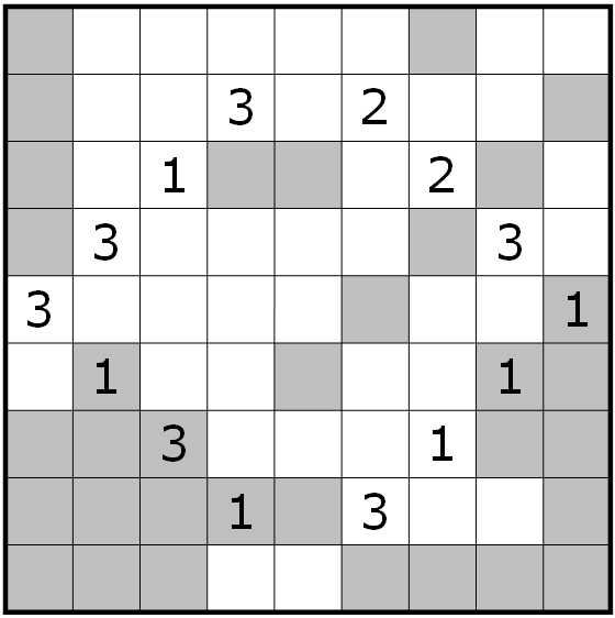 Place digits 1-3 in the grid so that in each row and column each digit appears three times. (Twice in the example.) Numbers in grey cells do not share an edge with a cell containing the same number. Numbers in white cells share an edge with at least one cell containing the same number.