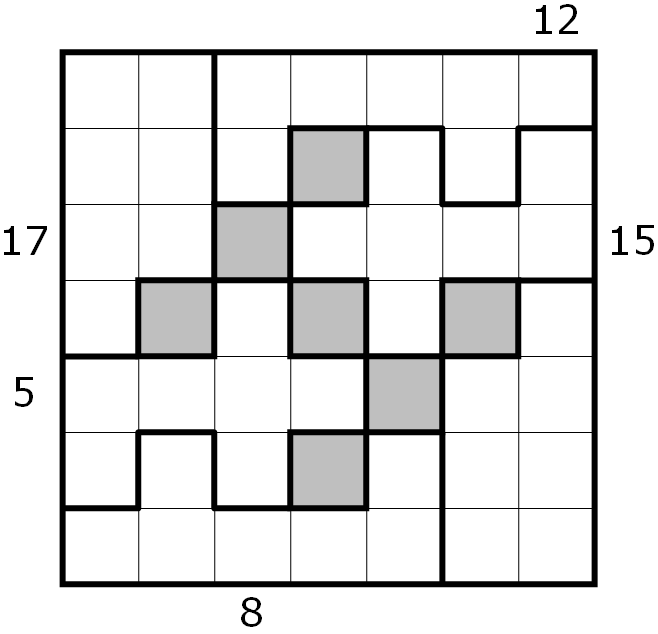 Place the digits from 1 to 7 in every row, column, bold outlined irregular area and the grey cells.