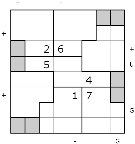 Place the digits from 1 to 8 in every row, column, boldly outlined irregular area and the grey cells. A symbol outside the grid means that the first two digits from that side are: