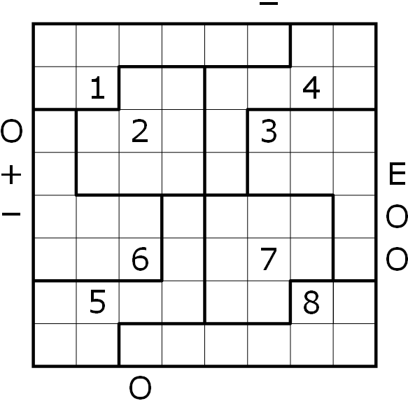 Place the digits from 1 to 8 in every row, column and bold outlined irregular area. A symbol outside the grid means that the first two digits from that side are: