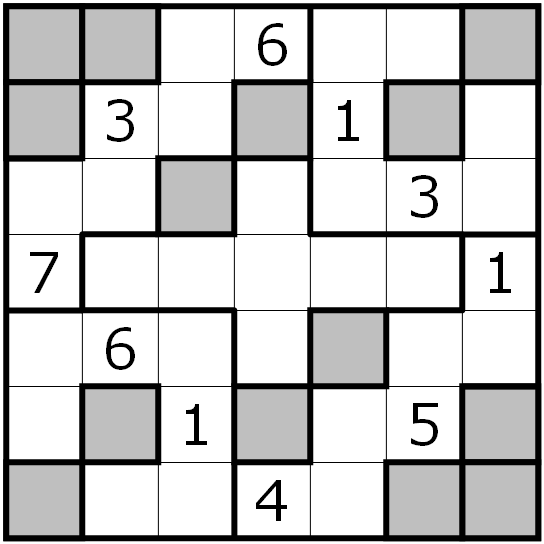 Place the digits from 1 to 7 in every row, column, bold outlined irregular area and twice in the grey cells.