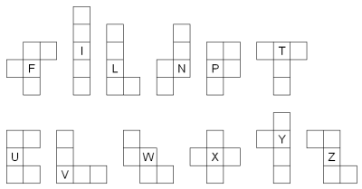 Solution code: Row 6, followed by column 6. For every cell the letter of the pentomino. (2x8 Letters in total.)