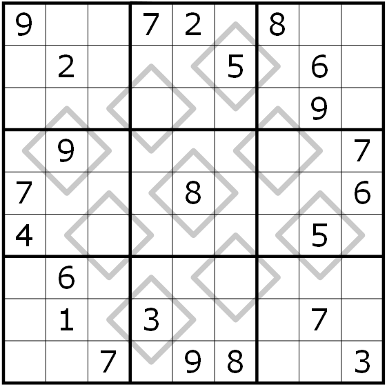 Place the digits from 1 tot 9 in every row, column and 3x3-block. There are some rhombus shaped figures in the grid.