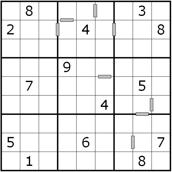 Apply classic sudoku rules. Additionally, if a gray bar is given between two adjacent cells, then the two digits in those cells sum to 10 or 11. If a gray bar is not given, the two digits cannot sum to 10 or 11.