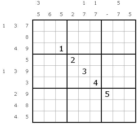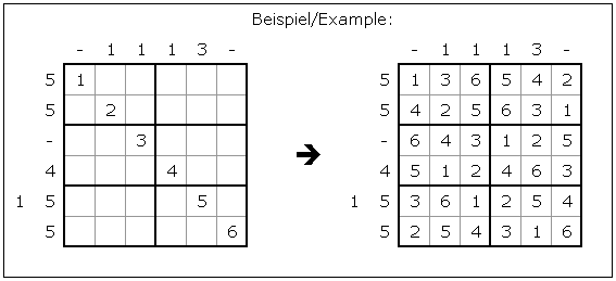 Platziere die Ziffern 1-9 in jede Zeile, Spalte und jeden 3x3-Block. Oben sind alle Zahlen angegeben, die in dieser Spalte von geraden Zahlen eingeschlossen werden, d.h. deren vertikale Nachbarn beide gerade sind. Links sind alle Zahlen angegeben, die in dieser Zeile von geraden Zahlen eingeschlossen sind, d.h. deren horizontale Nachbarn beide gerade sind. Die Randhinweise sind aufsteigend sortiert. Alle Zahlen sind angegeben. Insbesondere sind in den Zeilen und Spalten ohne Vorgaben keine Zahlen von geraden Zahlen eingeschlossen.
