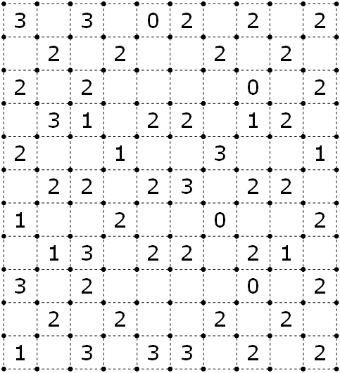 Zeichnen Sie entlang der gepunkteten Linien einen geschlossenen Rundweg ein, wobei nicht alle Gitterpunkte durchlaufen werden müssen. Die Ziffern geben an, wie viele der benachbarten Kanten für den Weg verwendet werden. Der Weg darf sich nicht selbst kreuzen oder berühren.
