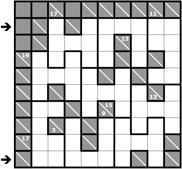 Platziere die Ziffern von 1 bis 7 in jeder Zeile, jeder Spalte und in den fett umrandeten Gebieten. Die Zahlen im Diagramm geben die Summe der Ziffern an, die in der entsprechenden Richtung erreicht wird; oberhalb der diagonalen Linie nach rechts, unterhalb nach unten.
