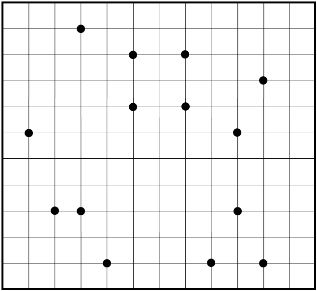 Platziere die gegebenen Pentominos so im Gitter, dass keine zwei Pentominos eine Kante gemeinsam haben. Sie dürfen sich aber diagonal berühren: Jeder Knoten, in dem zwei Pentominos eine Ecke gemeinsam haben ist mit einem schwarzen Punkt markiert. Pentominos dürfen gedreht und gespiegelt werden.