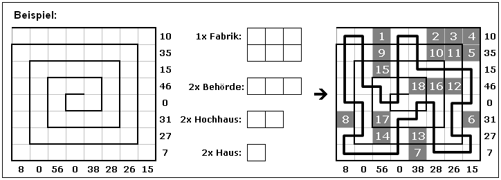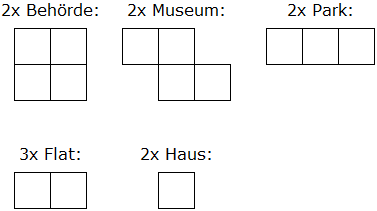 In dem vorgegebenen Gitter sind die abgebildeten Gebäude so zu platzieren, dass sie sich nicht gegenseitig berühren, auch nicht diagonal. Die Gebäude dürfen dabei gedreht un gespiegelt werden. Außerdem ist ein geschlossener Rundweg einzuzeichnen, der nur waagerecht und senkrecht verläuft und alle noch freien Felder genau einmal durchläuft.