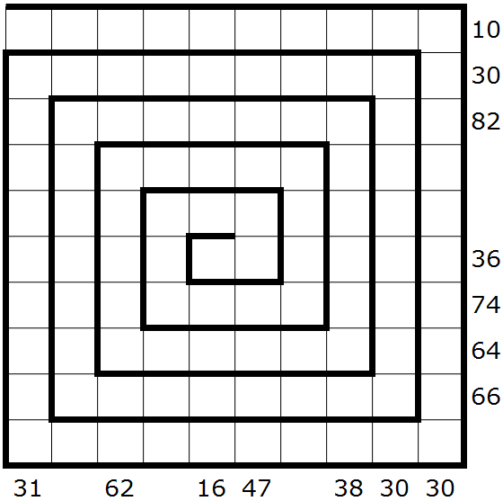 Das gegebene Gitter ist eine Spirale. Die Bausegmente werden von 1 bis 30 durchnummeriert, beginnend beim Eingang der Spirale (oben links) bis hin zum Zentrum. Die Zahlen außerhalb des Gitters sind die Summen der Bauteile in der entsprechenden Zeile oder Spalte.