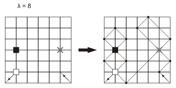 Ähnlich im weiteren Verlauf: Die Weglänge zwischen den zwei Betreten eines weissen Kreuzungspunktes muss 8,16... Kästchen betragen.