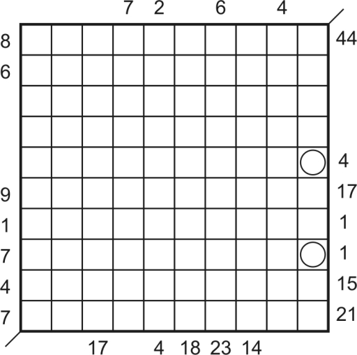 Lösungscode: Row 3, row 4 and column 10 ("-" for empty cells).