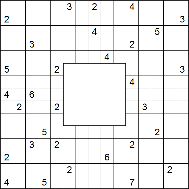 Einige der leeren Felder sind zu schwärzen, so daß alle weißen Felder orthogonal zusammenhängen, alle Schwarzfelder orthogonal mit einem Rand verbunden sind und kein 2x2-Bereich komplett ungeschwärzt bleibt.