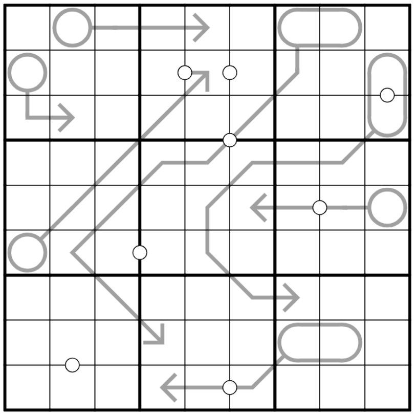 However, within each individual arrow (including its sum circle) all white dots have been given, even for diagonally consecutive digits. So, this applies to each individual arrow only, but not for any cell outside of arrows and not between two different arrows. This means that each arrow and its circle — including the transition between them — could be seen as an individual region on which all white dots have been given for orthogonally and diagonally consecutive digits.