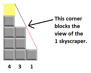 A potential line of sight that merely brushes the corner of a skyscraper without actually passing through it is considered to be blocked by that skyscraper. For example, in the sequence 431, only the 4 and 3 skyscrapers are considered visible - the 1 skyscraper is considered blocked by the corner of the 3 skyscraper.