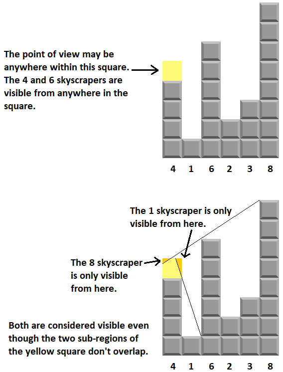 For example, in the sequence 416238, the 4, 1, 6, and 8 skyscrapers are all considered visible, even though the person needs to move to the right edge of the 4 skyscraper in order to see the 1 skyscraper, and needs to move to the left edge of the 4 skyscraper in order to see the 8 skyscraper.