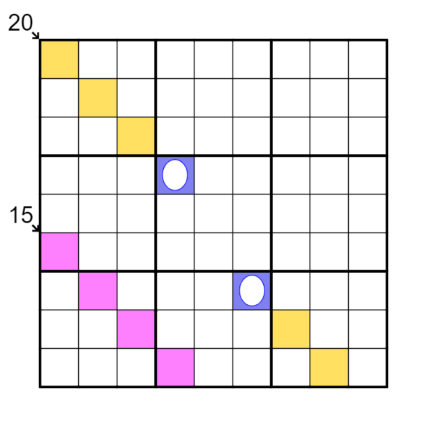 An example of the rule set can be found in this image. In the image, 20 is the sum of the yellow cells and 15 is the sum of pink/purple cells.