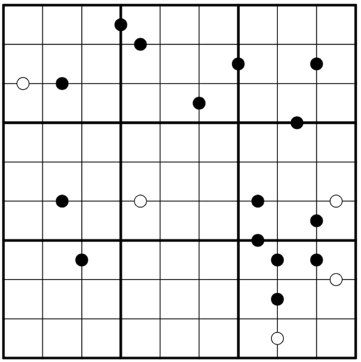 Es gelten die normalen Sudoku-Regeln. Benachbarte Ziffern, die mit einem schwarzen Kropki-Punkt markiert sind, haben ein Verhältnis von 2 zu 1. Alle *schwarzen* Punkte sind gegeben - für schwarze Punkte gilt die negative Bedingung. Benachbarte Ziffern, die mit einem weißen Kropki-Punkt markiert sind, sind aufeinanderfolgend. Es sind nicht alle *weißen* Punkte angegeben. Keine negative Einschränkung für weiße Punkte. Hinweis: 1 und 2 dürfen nebeneinander liegen, auch ohne Punkt. Ich denke, dass dieses Rätsel 1,5 von 5 Sternen für die Schwierigkeit für viele Löser hat. Wie immer sind Kommentare willkommen. Vielen Dank!