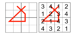 d. h. Linien verhalten sich wie Bereichssummenlinien, aber die Summe erhöht oder verringert sich um 1, wenn die Linie ein Kästchen kreuzt.