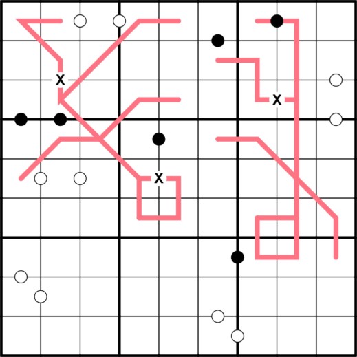 Oh, what a Feeling! Normal Sudoku rules apply. DUTCH WHISPERS- Numbers on red lines are at least 4 apart from their neighbors on the line. Numbers may repeat on red lines. KROPKI PAIRS- Numbers with a white dot between them are consecutive. Numbers with a black dot between them are in a ratio of 2:1. XV PAIRS- Numbers with an X between them sum to 10. Not all possible X and dots are given.