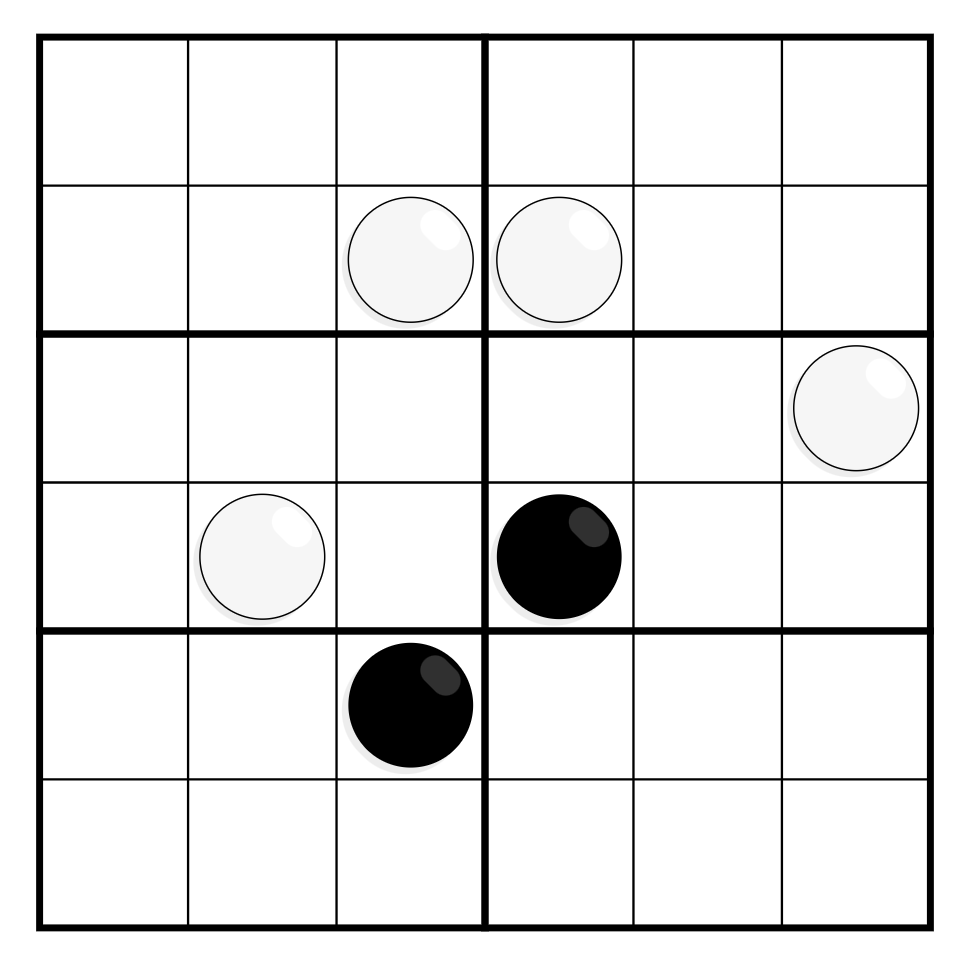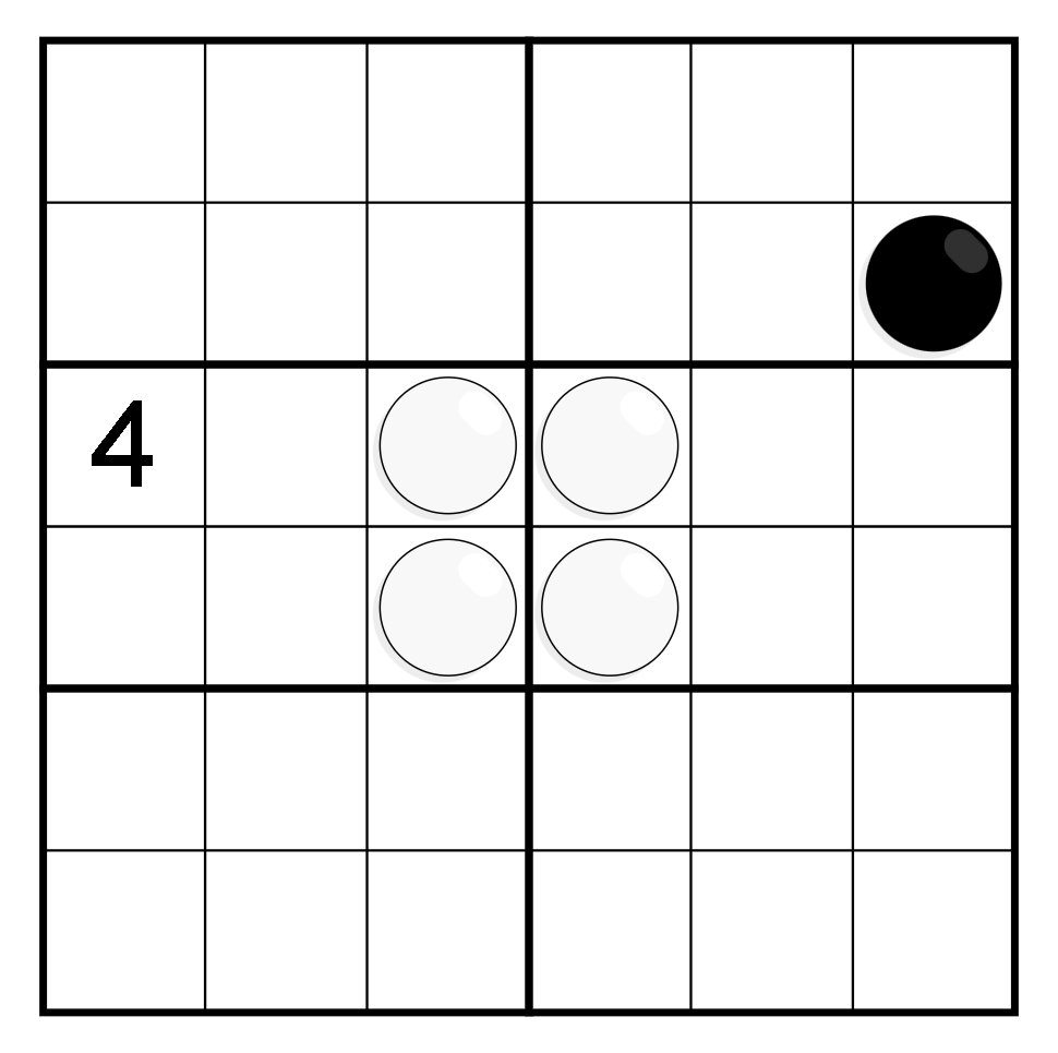 - Digits on either side of a white stone (in the same row/column) differ by exactly N, where N is the digit on the stone.