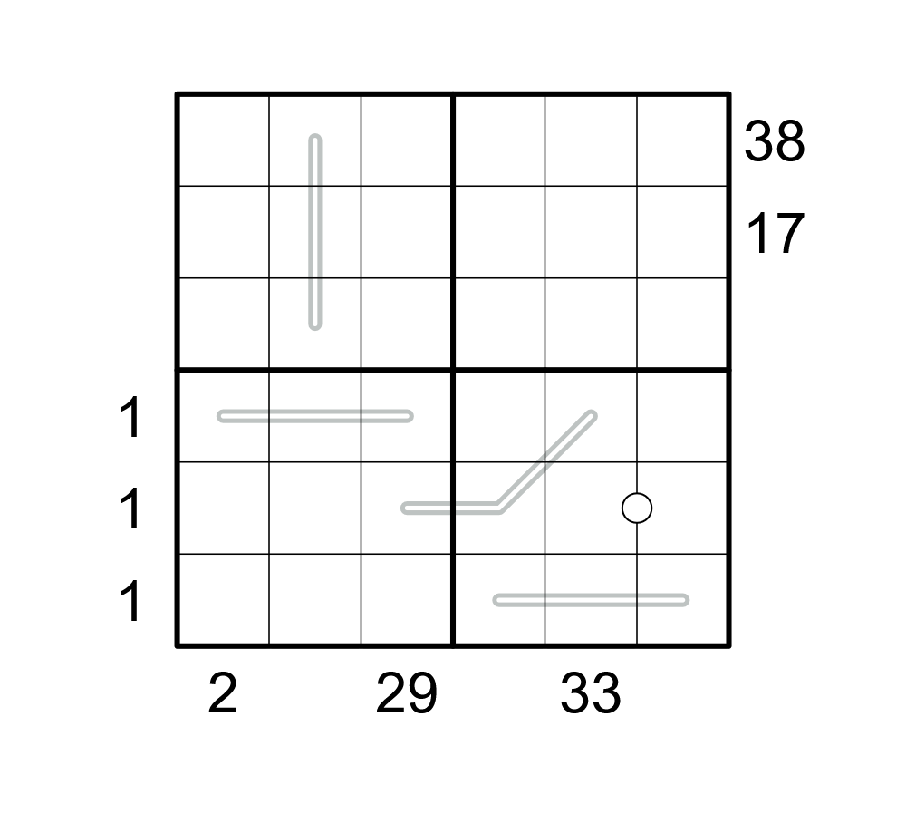 - X-sums: A clue outside the grid is the sum of the first X cells in the corresponding row/column, where X is the digit in the cell nearest to the clue.