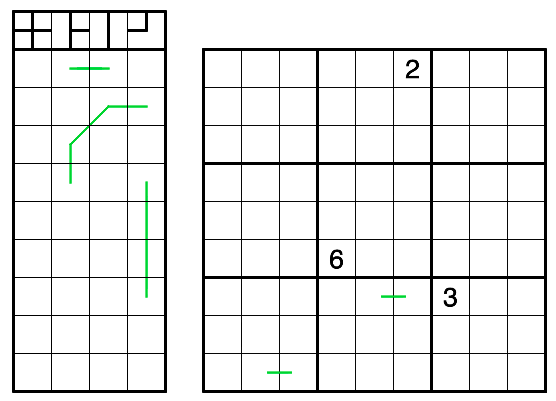 - U-Bahn: Draw a totally connected network through the centers of some cells in the right grid. The network may branch or turn, but may not have any dead ends. Given lines must NOT be a part of the network, i.e., there is no U-Bahn line between r7c5-r7c6, nor between r9c2-r9c3.