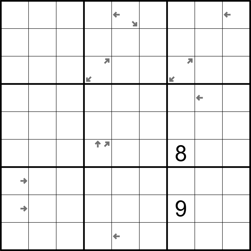 - Arrows: A digit in a cell containing an arrow counts how many loop cells are in the indicated direction (not including the cell with the arrow). Multiple arrows in the same cell counts loop cells independent of one another.