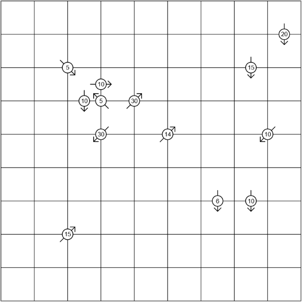3. Hinweise: Der Wert der Zelle, die N Schritte in Richtung eines Pfeils entfernt ist, wird im zugehörigen Kreis angegeben. N ist die Ziffer in der Zelle, von der aus der Pfeil ausgeht (Beispiel: Wenn r2c2 eine 3 wäre, müsste der Wert von r5c5 5 sein).