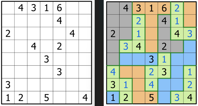 Fill the grid with 7 regions which do not touch orthogonally or diagonally and fill them with the digits 1 to 7. Divide the remainder of the grid into 15 regions, one of each size 1 to 15. Such a region may not contain repeated numbers, and it may only contain factors of its size (e.g. a region of size 6 may contain any combination of 1,2,3, and 6, including none of them).
