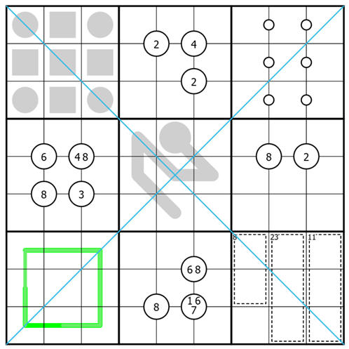 Box 2,4,6,8: Roadways – Quadruples: Digits in a Quadruple circle must be placed at least once in the four cells touching that circle.