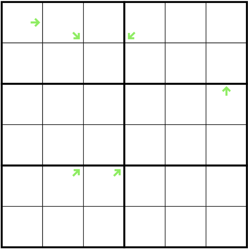 Rules: Normal Sudoku rules apply. Put the digits 1 to 6 once each into every row, column and 2x3 box.