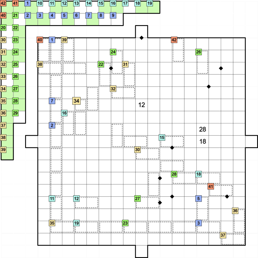 There are a total of 42 cages, and the rank numbers are color-coded according to the 10s digit of the rank. Given ranks are colored green in the auxiliary grid in the top left. For the solution check, when using numbers greater than 9, enter the 10s digit in the left corner of the top row of the polyomino and the unit digit in the left corner of its bottom row.