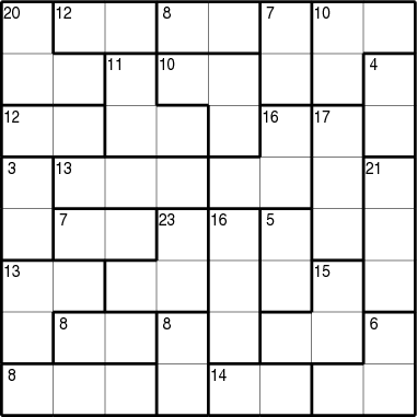 Place digits from 1 to 8 into the grid, so that each digit appears exactly once in each row or column. The small numbers indicate the sums of the digits in the outlined areas; within these areas, digits may repeat.