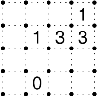 Zeichnen Sie entlang der gepunkteten Linien einen geschlossenen Weg ein, wobei nicht alle Gitterpunkte durchlaufen werden müssen. Die Ziffern geben an, wie viele der benachbarten Kanten für den Weg verwendet werden. Der Weg darf sich nicht selbst kreuzen oder berühren.