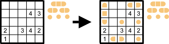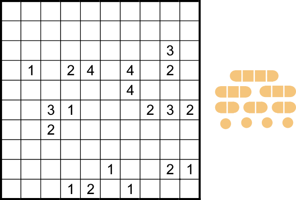 Finden Sie die abgebildete Flotte im Diagramm. Schiffe können den Rand des Diagramms berühren und beliebig gedreht werden. Sie berühren aber keine anderen Schiffe, auch nicht diagonal. Die Zahlen geben an, wie viele der waagerecht, senkrecht oder diagonal benachbarten Felder ein Schiffsteil enthalten. Die Zahlenfelder enthalten keine Schiffsteile.