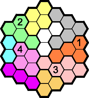 Füllen Sie das Diagramm mit Zahlen, wobei sich in jedem fett umrahmten Bereich mit n gleichfarbigen Feldern die Zahlen 1 bis n befinden. Benachbarte Felder müssen verschiedene Zahlen haben.